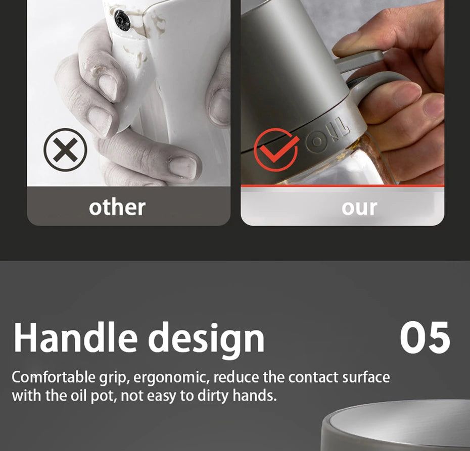 1.Our olive oil spray bottle with ergonomic handle, you can pick it up anytime while cooking, with nice feelings of comfort. Keep your hands free from greasy and kitchen tidy.